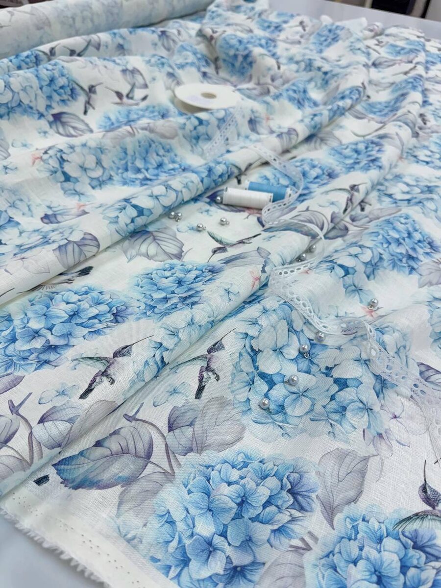 Чудесный лен с гортензией и маленькими птичками колибри в еще одном цвете