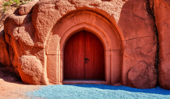 Все, кашляя и чихая, побрели за смерчем, он привёл их к скале с огромной сводчатой каменной дверью и рассыпался синим песком. Они озадаченно рассматривали дверь. Ни надписи, ни украшений на двери не было, кроме чётких линий, повторяющих контур двери. Удивляло, что камень двери имитировал дверевянные доски.