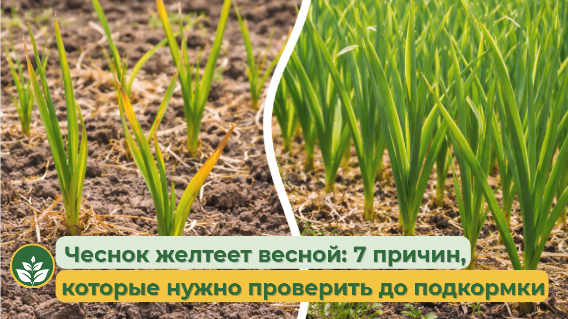Это самая частая причина. Весной почва ещё холодная, полезные бактерии «спят» и питание просто не доходит до растения. В первую очередь чесноку не хватает азота («вершки») и магния.