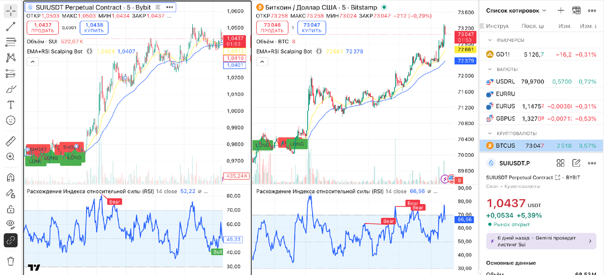 То есть вы смотрите на график, видите сигнал и входите руками на Bybit, Binance или другой бирже.