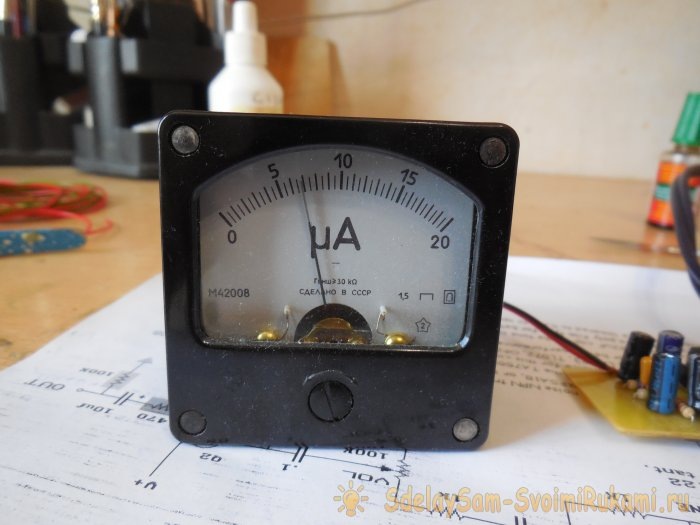 В наше время советские стрелочные головки доступны в продаже в широком ассортименте. Они различаются по форме, размеру и другим характеристикам. Я выбрал небольшую стрелочную головку М42008 за её компактность и привлекательный внешний вид. Для данной схемы подойдёт любая головка с током полного отклонения в диапазоне от 10 до 100 микроампер. Для большей наглядности можно заменить стандартную шкалу, градуированную в микроамперах, на специальную звуковую шкалу, отградуированную в децибелах. Однако подключение стрелочной головки к схеме следует осуществлять не напрямую, а через подстроечный резистор с номиналом 1-2 мегаома. Средний контакт резистора соединяется с одним из крайних контактов, который, в свою очередь, подключается к плате, тогда как оставшийся контакт подключается непосредственно к стрелочной головке. Это наглядно показано на фотографии ниже.