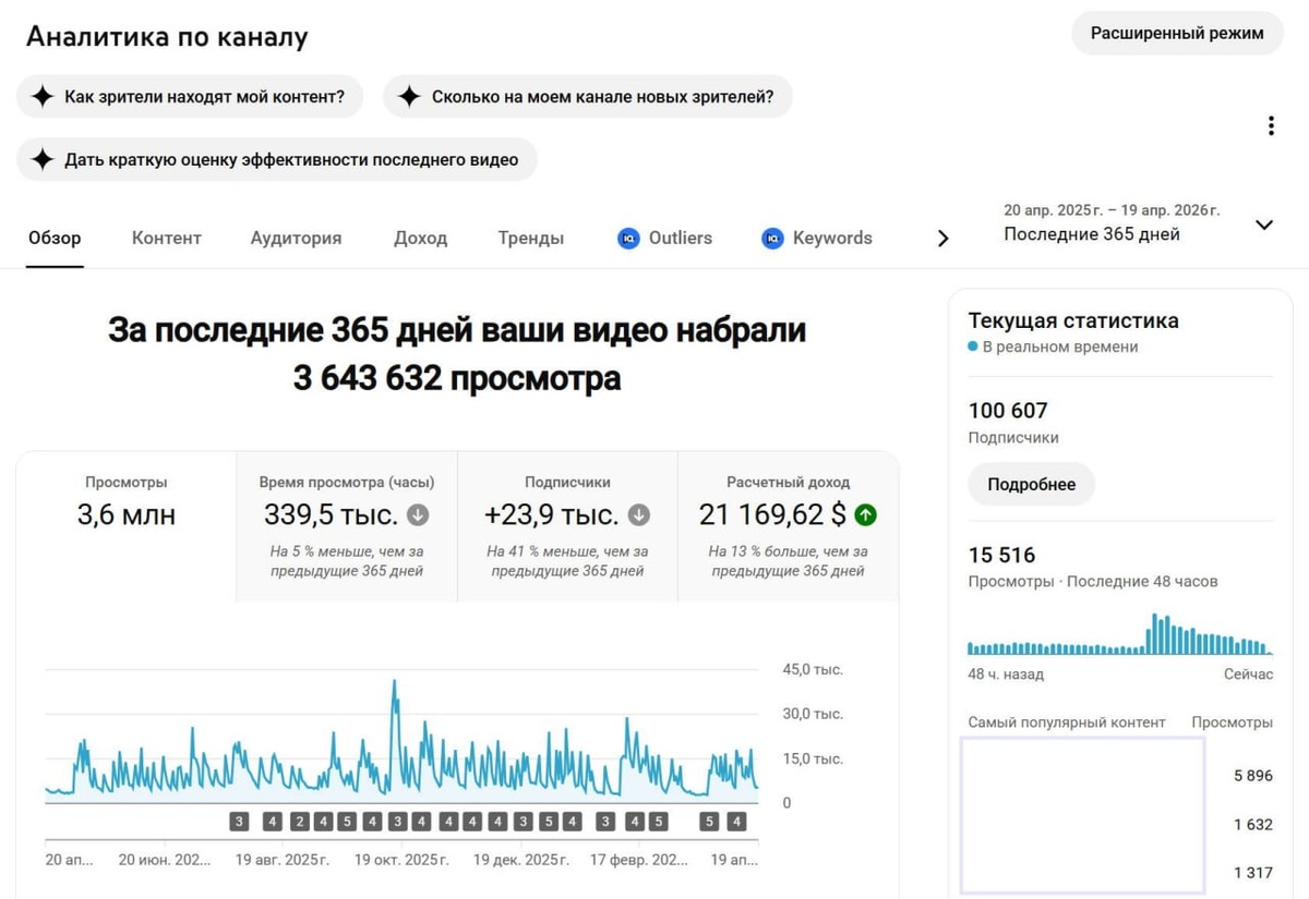ΠΎΠ΄Π½ΠΎΡΡΡ ΠΏΠΎΡΡΡΠ΅Π»Ρ Π½Π° 10 ΠΌΠΈΠ»Π»ΠΈΠΎΠ½ΠΎΠ² ΡΡΠ±Π»Π΅ΠΉ. ΠΠΈΠ½ΡΡΡ. ΠΡΠ°ΡΠ½ΡΠ΅ ΡΠΈΡΡΡ. ΠΠ΄ΠΈΠ½ ΠΌΠ΅ΡΡΡ, Π²ΡΠΎΡΠΎΠΉ, ΡΡΠ΅ΡΠΈΠΉ. ΠΠ΄Π΅-ΡΠΎ ΡΡΡΡ Π·Π΅Π»ΡΠ½ΠΎΠ΅ ΠΌΠΎΡΠ³Π½ΡΠ»ΠΎ β ΠΈ ΡΠ½ΠΎΠ²Π° Π²Π½ΠΈΠ·. Π ΡΠ΅ΠΏΠ΅ΡΡ ΠΏΠ°ΡΠ°Π»Π»Π΅Π»ΡΠ½ΠΎ ΠΎΡΠΊΡΠΎΠΉΡΠ΅ ΡΡΠ°ΡΠΈΡΡΠΈΠΊΡ YouTube. π ΠΠ°ΠΆΠ΅ Π½Π΅ Π³ΠΈΠ³Π°Π½ΡΡΠΊΠΈΠ΅ ΠΊΠ°Π½Π°Π»Ρ. ΠΠ΅ ΠΊΠ°ΠΊΠΈΠ΅-ΡΠΎ ΠΌΠΈΡΠΎΠ²ΡΠ΅ Π±Π»ΠΎΠ³Π΅ΡΡ Ρ ΠΊΠΎΠΌΠ°Π½Π΄Π°ΠΌΠΈ ΠΈΠ· 50 ΡΠ΅Π»ΠΎΠ²Π΅ΠΊ. Π Π²ΠΏΠΎΠ»Π½Π΅ ΡΠ΅Π°Π»ΡΠ½ΡΠ΅ ΠΊΠ°Π½Π°Π»Ρ, Π² ΡΠΎΠΌ ΡΠΈΡΠ»Π΅ ΠΌΠΎΠΈ Π½Π΅Π±ΠΎΠ»ΡΡΠΈΠ΅ ΠΏΡΠΎΠ΅ΠΊΡΡ. 3,6 ΠΌΠ»Π½ ΠΏΡΠΎΡΠΌΠΎΡΡΠΎΠ² β $21 000 Π΄ΠΎΡ