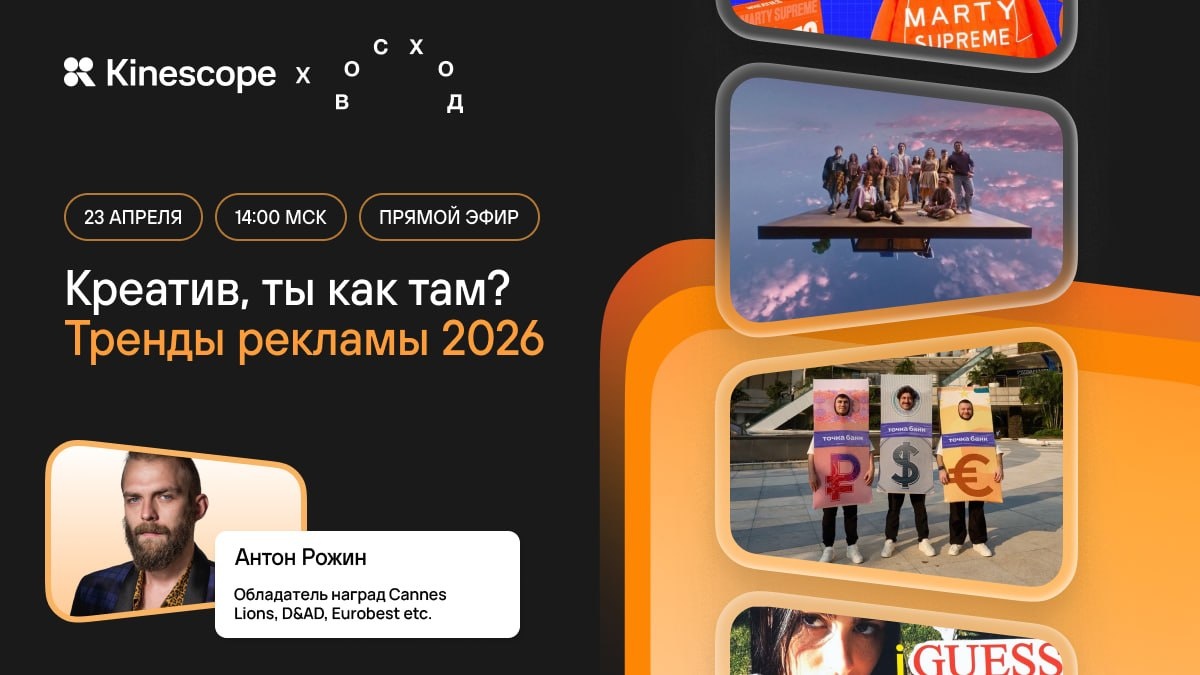 Много интересного о трендах рекламы в 2026 году (⚡️) 23 апреля в 14:00 МСК Обсудим: 🔘Как бренды уходят от нейтральности — и почему лучше быть спорным, чем незаметным. 🟣Кампании «360»: почему работает единая коммуникация через все каналы. 🟡Личный опыт взаимодействия с брендом: из офлайна в онлайн и обратно. 🔴Метамодерн в рекламе: почему мир не делится на черное и белое и что это значит для брендов сегодня. Бонус участникам — промокод на 30 дней тарифа «Супер» для новых клиентов Kinescope. Регистрация по ссылке.