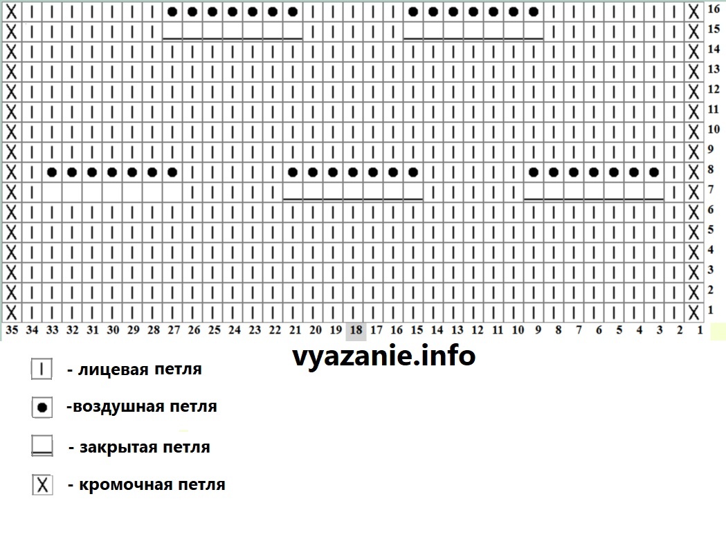 Этот узор похож на дырки в сыре. Причём, его легко рассчитать на любой размер. И применить в самых разных моделях. Вяжется поворотными рядами платочной вязкой очень просто. 6 рядов платочной вязки. В 7-ом ряду формируем дырки. Если нужны круглые, как у меня, тогда повторяем: *7 петель закрываем, 5 лицевых*. 8 ряд. Петли на спице вяжем лицевыми, над закрытыми петлями набираем 7 воздушных петель. 9-14 ряды вяжем лицевыми. 15 ряд. Смещаем узор. Дырки будут над петлями, причём, начинаем над последней закрытой. 16 ряд. Над закрытыми петлями набираем 7 воздушных петель. Повторяем эти 16 рядов. Схема узора. Если дырки нужны длиннее, закрываем не 7 петель, а столько сколько нужно. В моём образце 35 петель, 2 из которых кромочные. Я, как всегда, экспериментировала. Сначала петли закрывала, сразу провязывая по 2 вместе, снова эту петлю помещала на левую спицу и провязывала 2 вместе 7 раз. Последние (верхние на фото) 2 раза сначала петлю провязывала, а потом её закрывала. Дыры получились не к