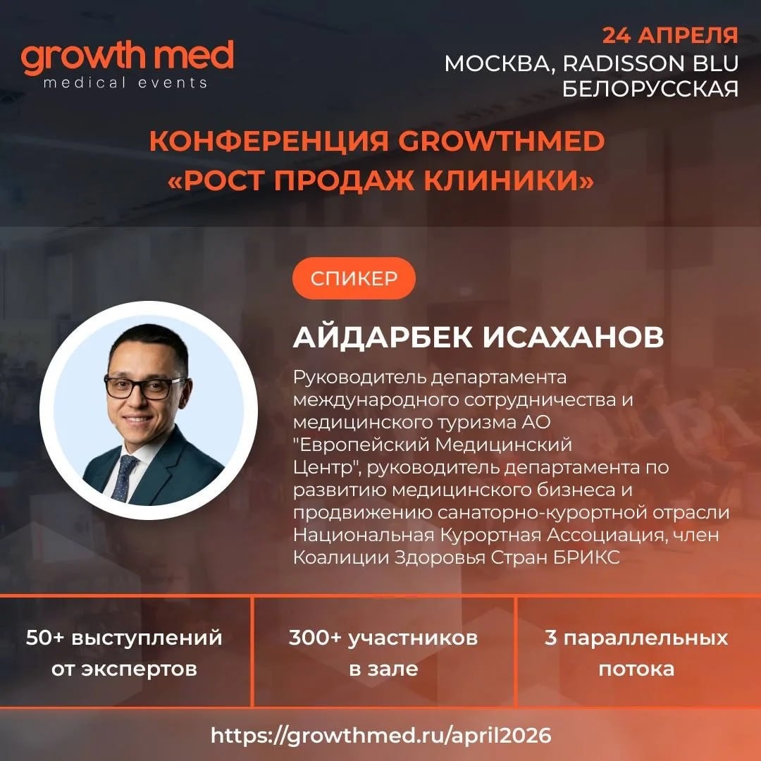🚀 24 апреля Айдарбек Исаханов представит Национальную курортную ассоциацию на конференции GrowthMED «Рост продаж клиники», где поделится