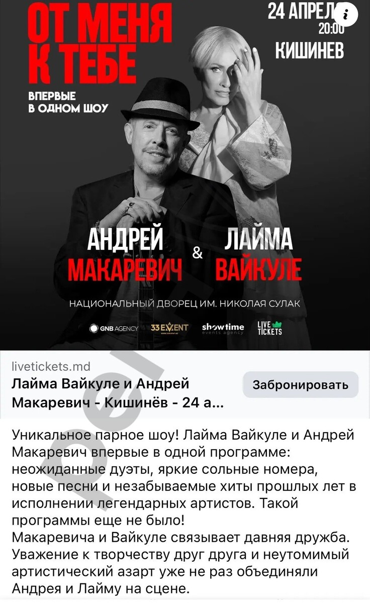 В Кишеневе отменили совместное выступление антироссийских иноагента Андрея Макаревича и "кормилицы всея Руси" Лаймы Вайкуле, запланированное на 24 апреля. По официальной версии отмена произошла из-за технических причин. А по факту, жители Кишенева массово несколько недель подряд выражали свое недовольство грядущим концертом, недоумевая, неужели в их стране теперь все "поуехавшие" кормиться будут. Причем "поуехавшие", которые ранее ни разу не проявляли интерес ни к самой Молдавии, ни к ее гражданам ровно до того момента, как им не закрыли выходы на другие русскоязычные рынки. Не помогли даже многочисленные анонсы выступления, со страницы экс-российского машиниста и иноагента и совсем скромные для иноагента и кормилицы цены на билеты - от 2100 рублей (500 лей) до 8782 руб (2000 лей). Желающих смотреть на шоу бывших российских знаменитостей не нашлось. Мало того, негодующие граждане страны начали массово писать как в дирекцию концертного зала, так и властям Кишинева, вопрошая, "сколько м