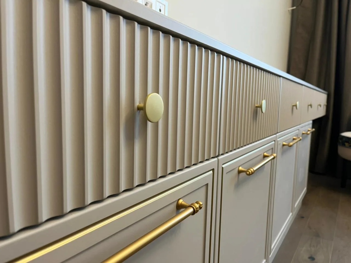 Чтобы завершить образ, мы создали шкаф в классическом стиле — он идеально вписался в ансамбль. Корпус гарнитура изготовлен из надёжного ЛДСП Egger, а столешница, видимые детали и фасады — из МДФ с плёнкой. Рифлёные панели «Волна» и строгие прямые фасады с фрезеровкой «Джулия» и благородной патиной создали изысканный стиль этой мебели.