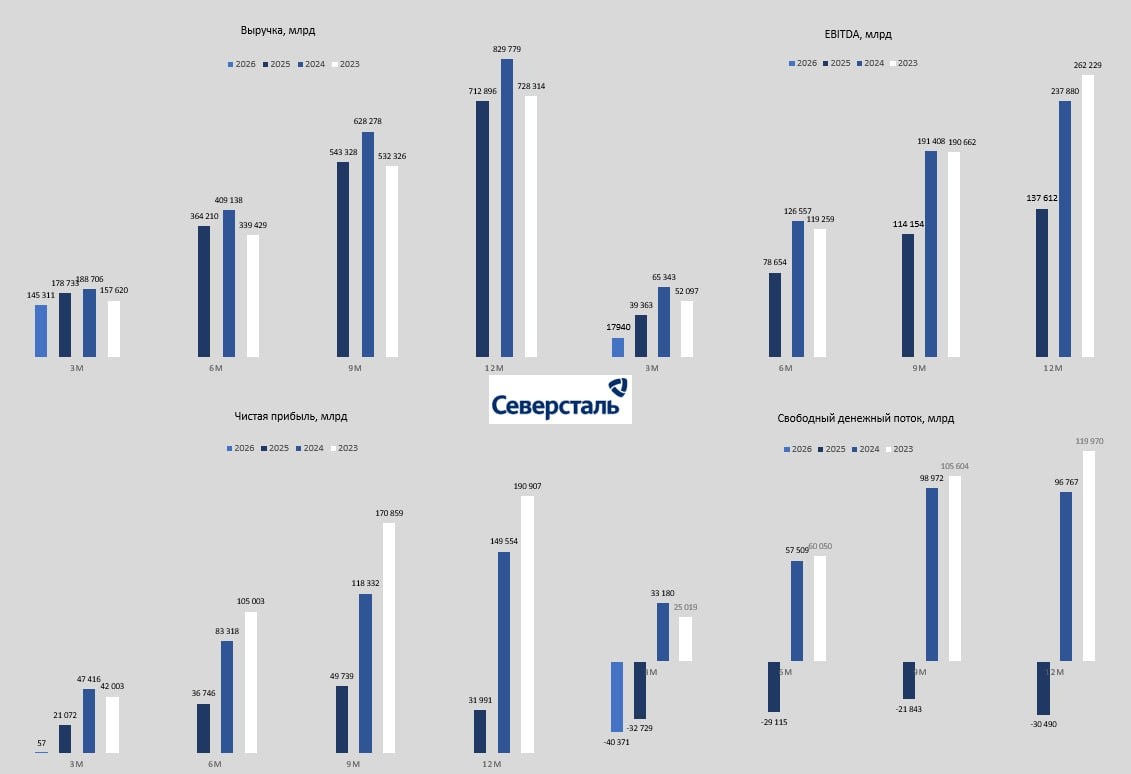 Если прошлые годы мы хвалили компанию за устойчивость, то сейчас отчёт по МСФО за 1 кв. 2026 года — это констатация глубокого кризиса в отрасли, и возможно, всей страны. 🔹Выручка 145,3 млрд руб. (-19% г/г) 🔹EBITDA 17,94 млрд руб. (-54% г/г) 🔹Чистая прибыль номинальные 57 млн руб. (-99,7%). 🔹Рентабельность по EBITDA схлопнулась до 12% с 22% годом ранее 🔹FCF -40,4 млрд руб. (минус растёт) 🔍 Что пошло не так? Главная проблема не в том, что стали продавать меньше (объёмы упали всего на 1%), а в том, ЧТО и КОМУ продавали: ➡Доля продукции с высокой добавленной стоимостью рухнула на 7 п.п. до 45%. Вместо дорогих труб большого диаметра компания гнала на экспорт дешёвые слябы и чугун (рост продаж полуфабрикатов на +80% г/г). ➡Потребление стали в РФ за квартал рухнуло на 15%. Жесткая ДКП от ЦБ (ставка 15%+) «придушила» стройку и промышленность. ➡Плюс к этом крепкий рубль делает импорт из Китая гораздо привлекательнее, а экспорт - менее прибыльным (мягко говоря). Цены на горячекатаный