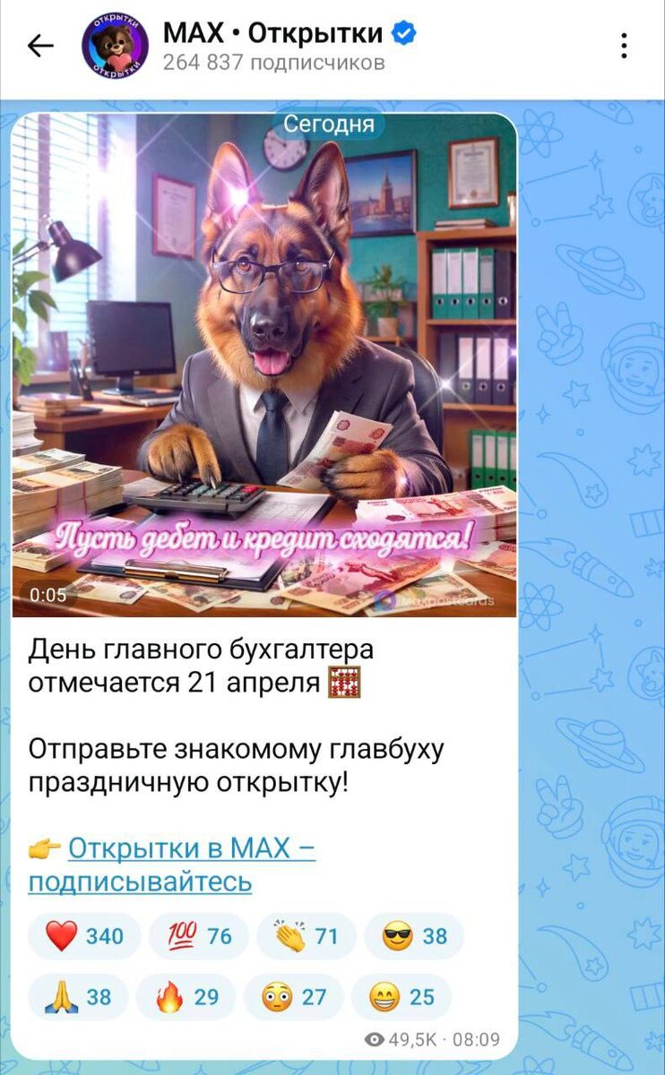 ЧТО: Макс начал использовать пса с мема как своего маскота. Он уже появился в канале с открытками. У Максимов сегодня чудесный день... CtrlAltDelights- подписаться