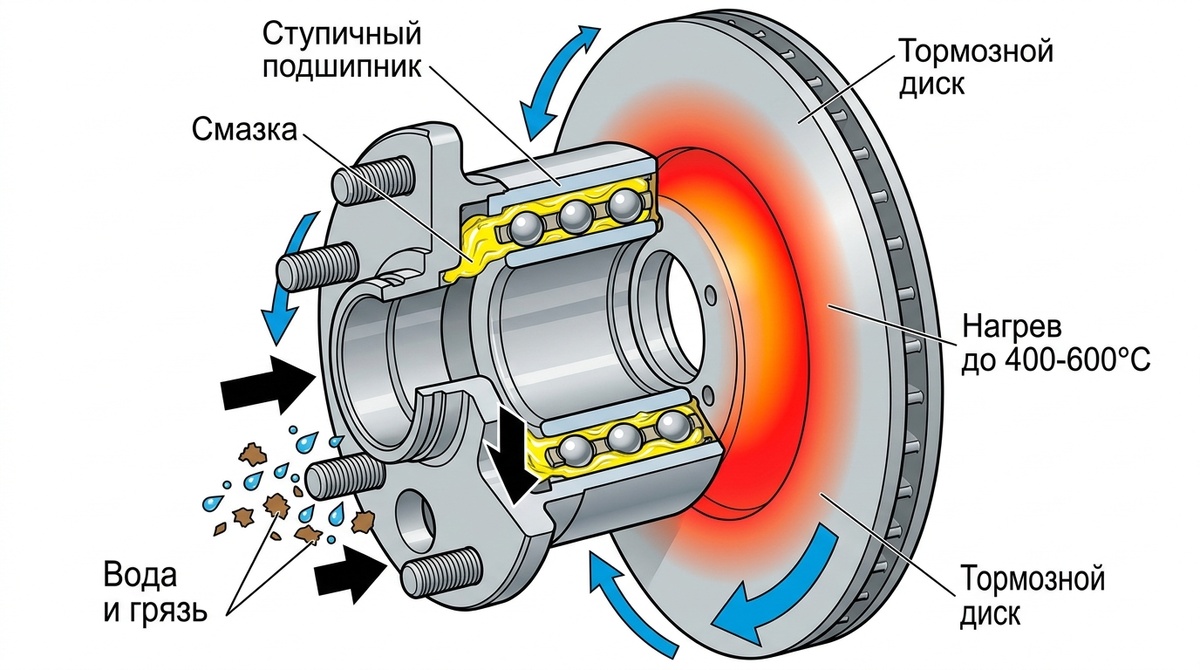 Ступичный подшипник — один из тех узлов, о которых вспоминают, только когда он начинает выть. А зря: правильно подобранная смазка для подшипников ступицы способна в разы продлить его ресурс и отсрочить дорогостоящую замену. Разбираемся, какие требования предъявляются к этому узлу, как распознать первые признаки неисправности и какую смазку для ступицы колеса выбрать — чтобы не переплачивать и не менять раньше времени. Ступица работает в жёстких условиях: нагрузки от веса автомобиля, ударные нагрузки при проезде ям, нагрев от тормозного диска, вода и грязь с дороги. При этом состав внутри подшипника закладывается на длительный срок — иногда на весь ресурс детали. Это означает, что к нему предъявляются особые требования: Термостойкость. Тормозной диск при интенсивном торможении разогревается до 400–600°С, часть тепла передаётся на ступицу. Обычные консистентные составы при таких температурах расплавляются и вытекают, оставляя подшипник без защиты. Водостойкость. Ступица постоянно контак