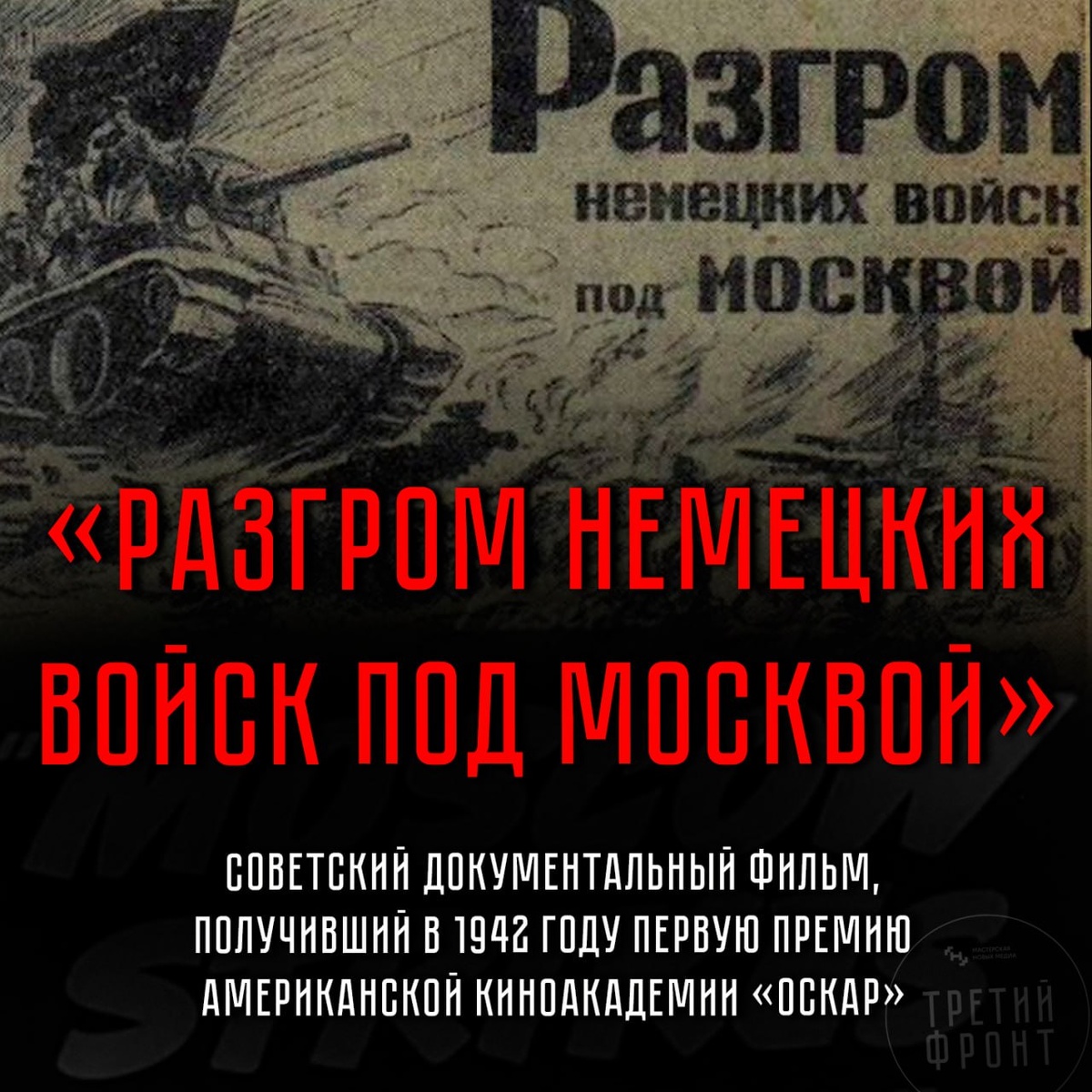 В ноябре 1941 года Сталин поручил снять документальный фильм о боях под Москвой. Он хотел запечатлеть на пленку хроники наступления советской армии. Работу вела Центральная студия кинохроники, в съемках принимали участие фронтовые операторы. Один из них, кинооператор Роман Кармен вспоминал: Киногруппа Западного фронта вместе с операторами Центральной студии, снимавшими в Москве, насчитывала не более тридцати человек. Нетрудно представить, какая нагрузка падала на каждого, снимавшего в те дни. Кинорепортеры были закреплены за армиями, но вместе с тем каждый был в ответе за широкий участок фронта, оператор должен был, в зависимости от хода событий, принимать самостоятельные решения, действовать маневренно, не ожидая приказа. Люди работали с предельным напряжением. Особенно воодушевились, узнав о том, что решено создать фильм «Разгром немецких войск под Москвой» Это первая советская картина, получившая премию американской киноакадемии «Оскар» в категории «Лучший документальный фильм» в 1