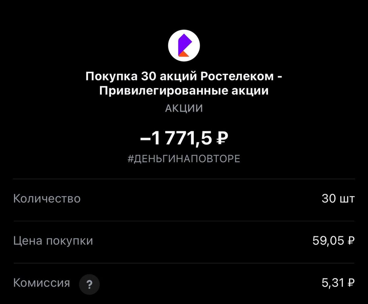 ! Покупка в стратегию #деньгинаповторе, добавляем еще одного эмитента. Статистика портфеля на стороннем сервисе, можно посмотреть по "ссылке" 🟢 ПОКУПКА Эмитент: "Ростелеком-преф" Тикер: #RTKMP Цена покупки: 59.05 rub 3 лота 🔗 чат для общения "тут" TG MAX