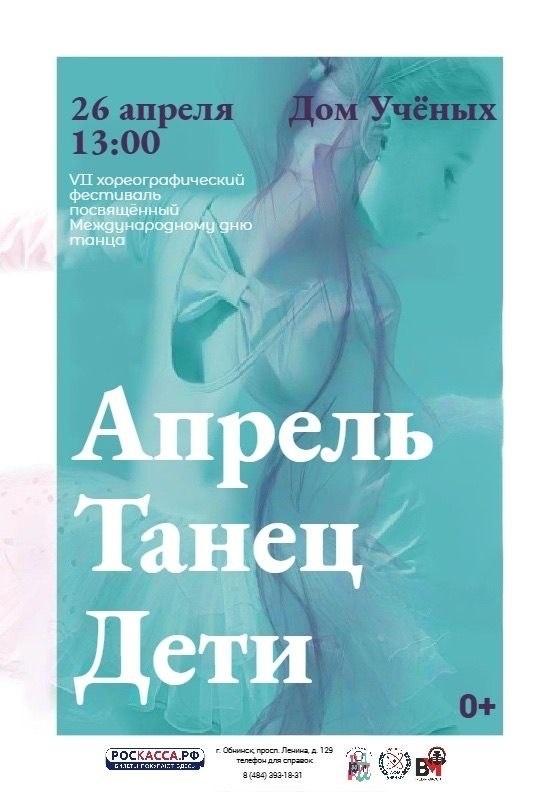 " В честь Международного дня танца, театрально-хореографический центр "Подмостки" проводит фестиваль танца "АпрельТанецДети". Это уникальное событие состоится 26 апреля 13:00 в Доме Ученых, и станет настоящим праздником для всех любителей танца, детей и их родителей. Фестиваль "АпрельТанецДети" объединит талантливых исполнителей и хореографические коллективы, которые представят зрителям яркие и захватывающие номера. В программе фестиваля примут участие: Хореографические коллективы из Обнинска и Калужской области. Каждый из этих коллективов представит свои лучшие работы, продемонстрировав разнообразие стилей и направлений в танце. От классических балетных постановок до современных хореографических экспериментов – каждый зритель найдет что-то по душе. Фестиваль "АпрельТанецДети" – это не только возможность насладиться великолепными выступлениями, но и шанс для детей проявить свои таланты, вдохновиться и узнать больше о мире танца. Мы приглашаем семьи с детьми, любителей искусства и