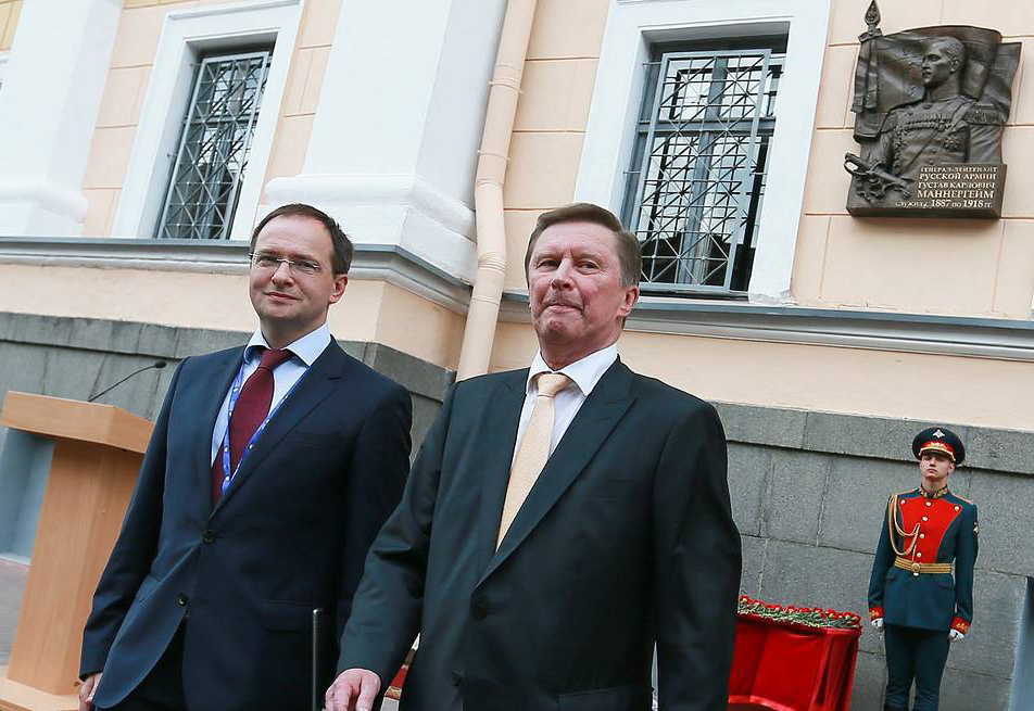 Переобувание господина Мединского на фоне памятной доски Маннергейму