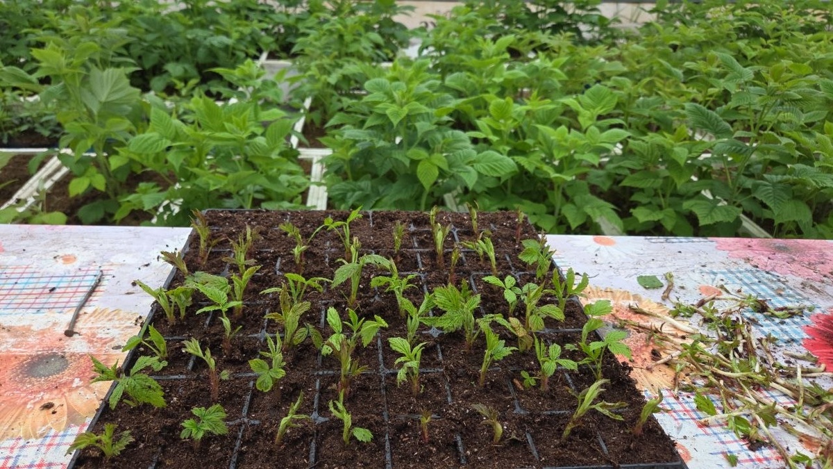 На улице дождь, а мы тыкаем крапивку малины. После холодов ящики с малиной поедут на площадку на ПМЖ, а то в теплице очень быстро сохнут, уже высокие, мощные, листья лопухи тянут влагу