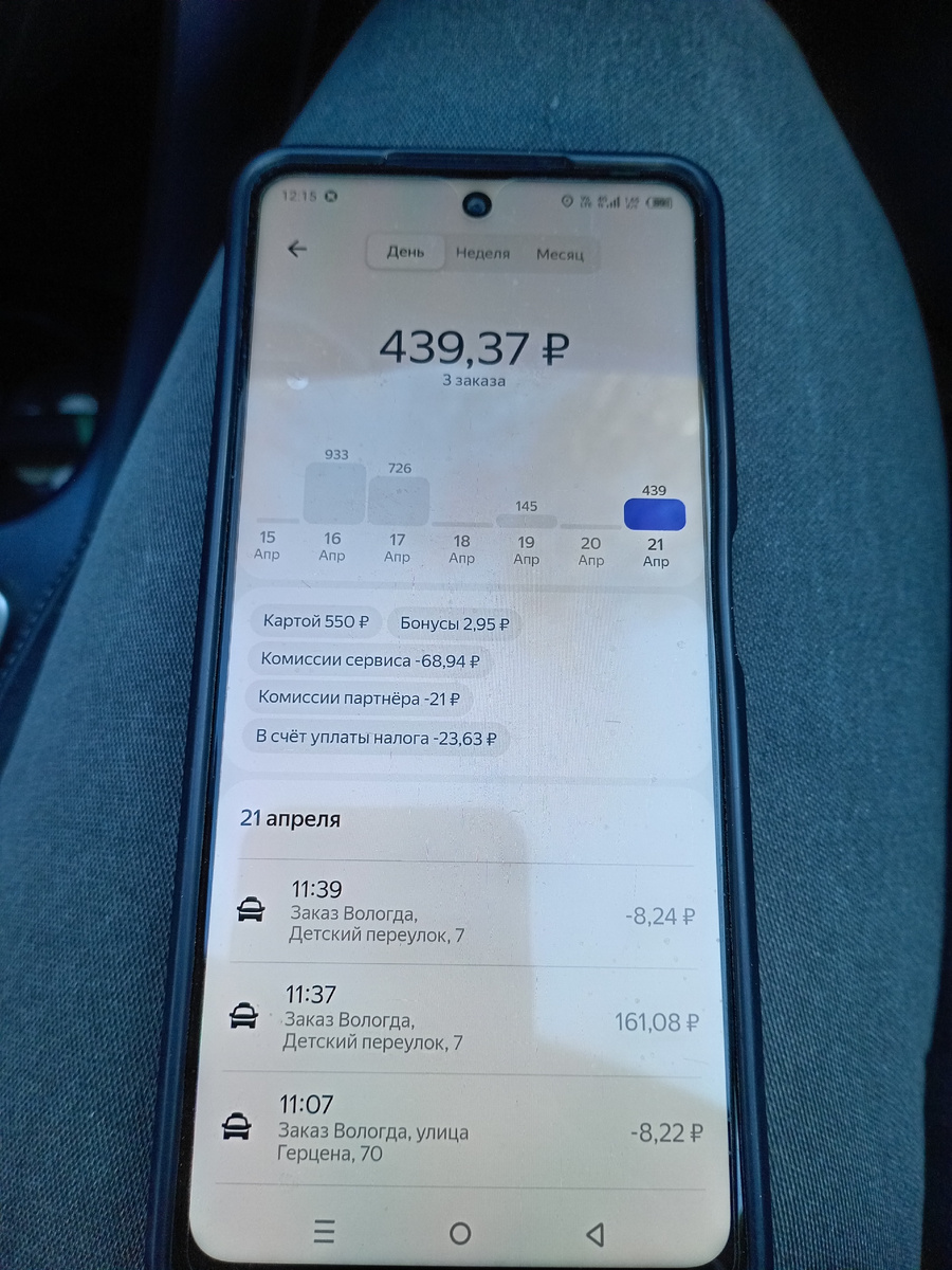 И первым нам выпала Яндекс Доставка. 3 частника подряд. Стоимость заказов от частных клиентов не так высоки, плюс с них берут огромную комиссию. Поэтому 3 заказа и вот такая цена: