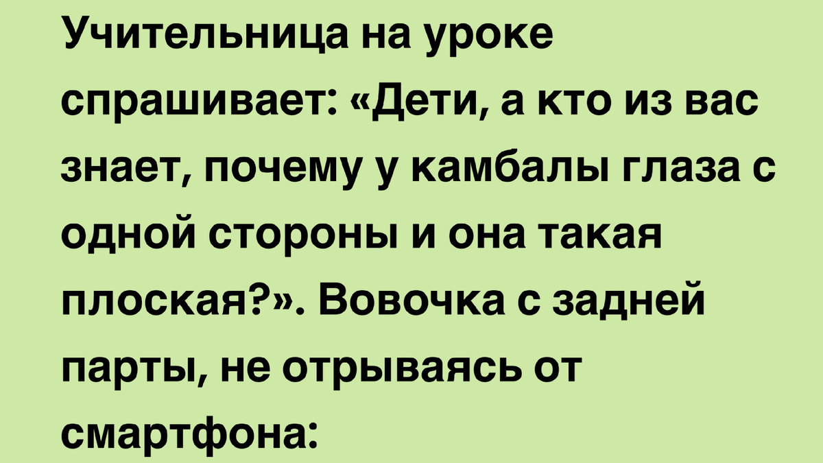 Учительница на уроке спрашивает: «Дети, а кто из вас знает, почему у камбалы глаза с одной стороны и она такая плоская?». Вовочка с задней парты, не отрываясь от смартфона: «Потому что она с китом спала!». Марья Ивановна в ужасе: «Вон из класса! А кто скажет, почему у рака глаза такие большие и выпученные?». Вовочка уже в дверях: «А он всё это видел!».