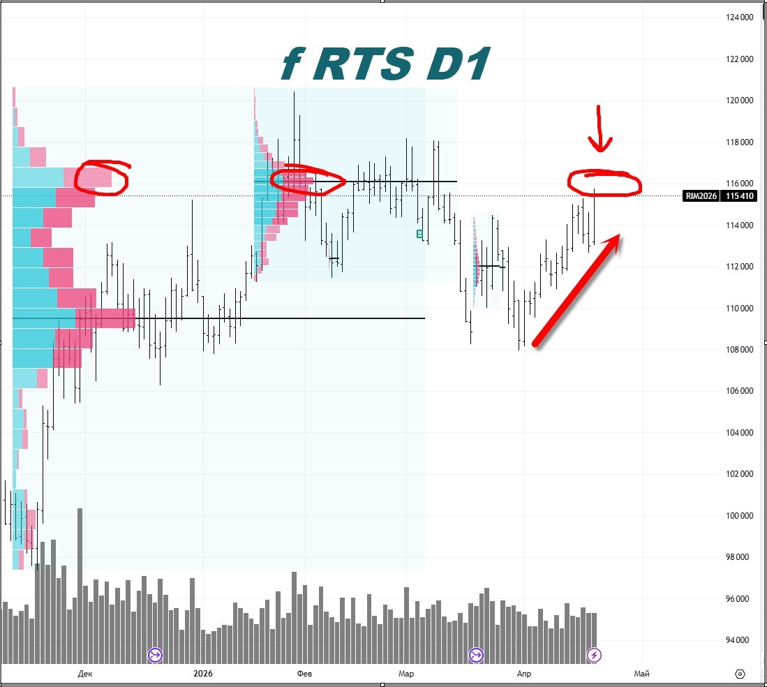 Сейчас рынок подводит к очень интересной точке. И если вы её не видите — значит просто смотрите не туда. По фьючерсу на индекс РТС цена пришла прямо в сильный уровень продаж. Причём это не просто линия “на глаз”, а зона, которая подтверждается и объёмом, и поведением цены на старших таймах. И вот здесь начинается самое важное. Снизу движение вроде бы есть. Цена растёт. Но как растёт? Проколами. Без нормального импульса. 💡Это не сила — это слабость, замаскированная под рост. А сверху сидит продавец. И не тот, которого “может быть увидим”, а тот, который уже проявлялся и, скорее всего, снова даст реакцию. Что это значит на практике? Что сценарий “просто полетим вверх” — мягко говоря, под вопросом. Гораздо логичнее смотреть в сторону разворота. ❗️Но не гадать, а дождаться нормального сигнала. Скорее всего, будет классика: небольшая болтанка между уровнями ➡️ вынос вверх ➡️ заход в сильную зону ➡️ и уже там реальные продажи. Вот это и есть момент, где делаются деньги. Не “когда уже всё