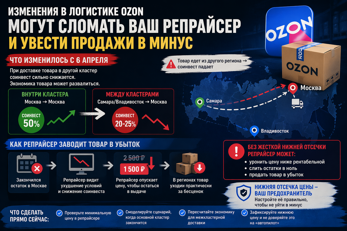 После обновлений логики Ozon, которые начали заметно влиять на экономику продаж с 6 апреля, у селлеров появилась новая зона риска. Речь не только про логистику как таковую, а про связку из трех факторов: межкластерная доставка, снижение соинвеста и автоматическое ценообразование.