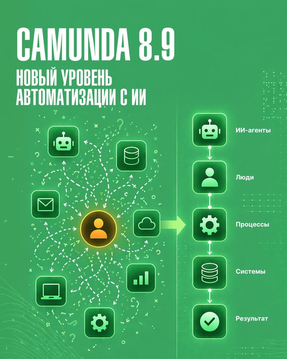 : 👉 как встроить их в реальные бизнес-процессы? Потому что сами по себе агенты не решают задачу. Без оркестрации они остаются отдельными инструментами, а не частью системы. Camunda 8.9 фокусируется на объединении AI-агентов, людей и систем в единый управляемый и контролируемый бизнес-процесс. Ключевая идея релиза — сочетание детерминированной логики, обеспечивающей предсказуемость и прозрачность действий, с решениями на базе ИИ, добавляющими гибкость и адаптацию в процессе выполнения. В результате процессы могут обрабатывать ожидаемые сценарии с точностью и при этом корректно реагировать на изменения — без потери управляемости. Что важно в 8.9: ✔ встроенный журнал действий для прозрачности и соответствия требованиям; ✔ глобальные обработчики задач — единые правила и контроль сроков для всех пользовательских задач; ✔ поддержка MCP — чтобы AI-агенты могли напрямую работать с системой; ✔ взаимодействие агентов между собой (A2A); ✔ поддержка реляционных баз данных — без изменений баз