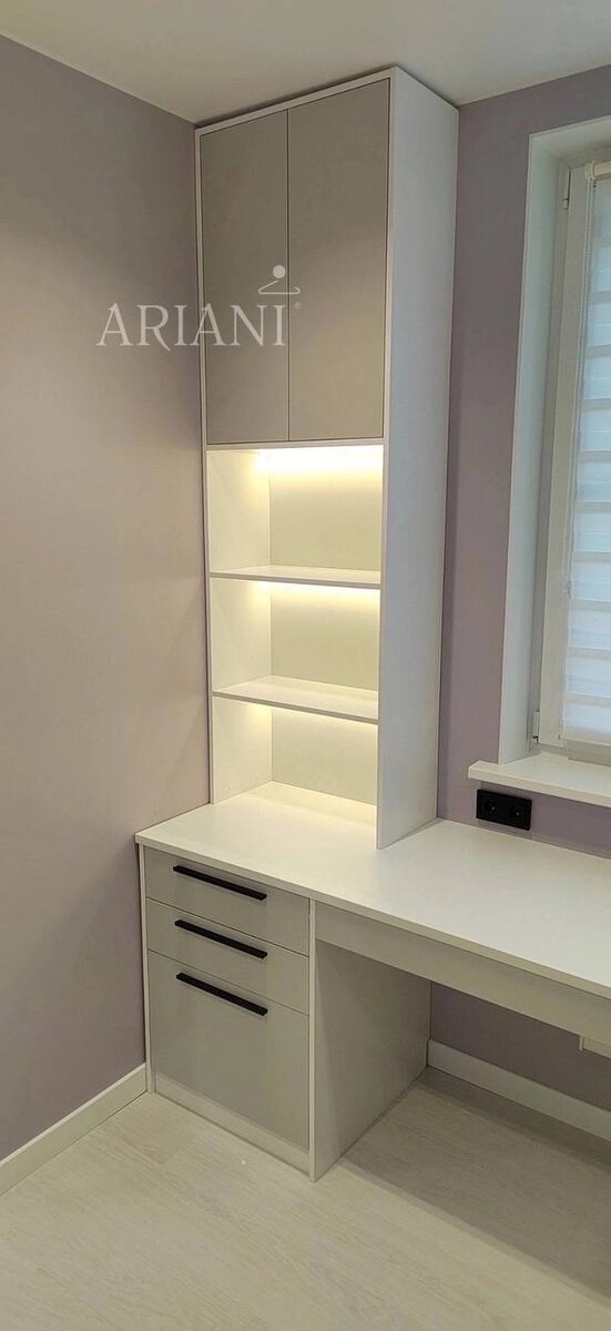 ? 😄 Обустройство комнаты для подростка всегда драма! Могут быть слёзы, психозы, споры, конфликты, но в любом случае это терзания о том, как совместить несовместимое! Родителям нужно, чтобы было удобно учиться и хранить вещи, аккуратно, стильно (правда, по своему представлению, которое может быть правильным, но отличаться от вкусов ребёнка). А вот ребёнку хочется новый телефон, компьютер, наконец, сделать комнату под себя: сейчас в почёте у них удобный диванчик или кровать, технологичная функциональность и «не как у малышей». Мы знаем, как помирить родителей и детей, учесть все интересы! В этом проекте нам нужно было на небольшом пространстве уместить всё: и вместительный шкаф для одежды, и полноценное рабочее место, и зону для тетрадей, книг. А ещё место, чтобы убрать зарядки, наушники, гаджеты. Обычно такие конструкции выглядят как громоздкая «стенка». Но наши дизайнеры нашли изящное решение. Мы спроектировали единый гарнитур (длина 2140 мм, высота под самый потолок 2565 мм), гд