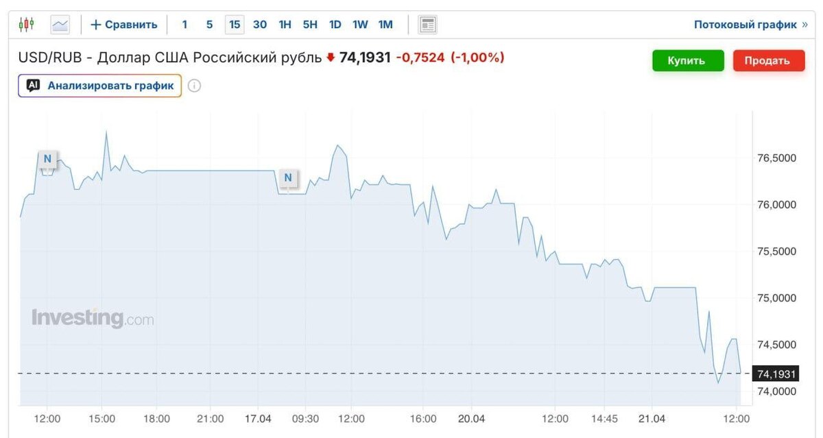Сейчас курс упал до 74,5 рубля — последний раз такая низкая отметка была в 2023 году.