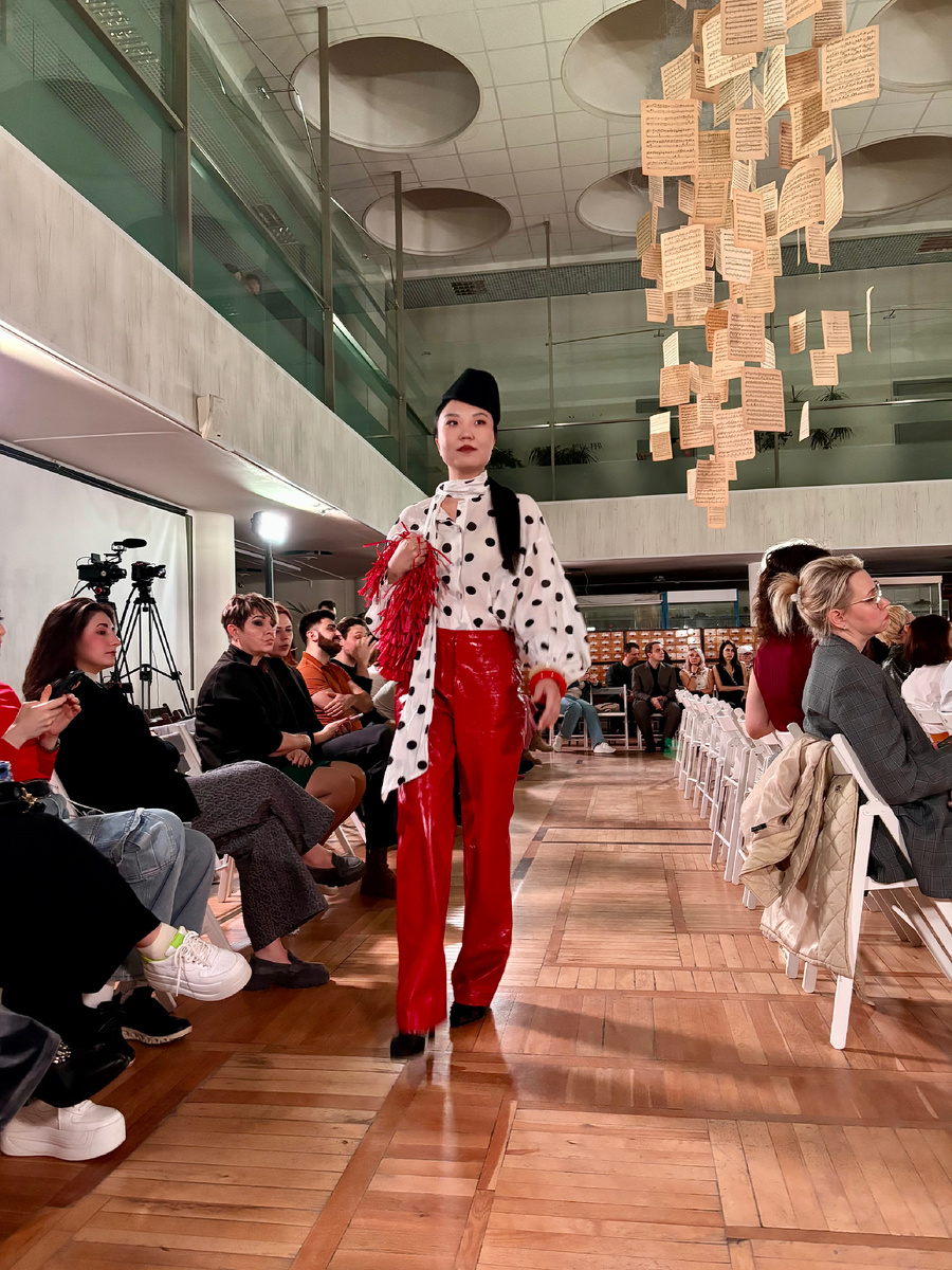 Я наслаждалась тем, как ткани взаимодействуют с пространством: строгая геометрия библиотечных стеллажей вдруг становилась мягче, когда мимо проплывало платье из струящегося шёлка. Каждая коллекция была не просто набором вещей — это были высказывания. И библиотека, хранящая тысячи высказываний на бумаге, стала для них идеальным резонатором.