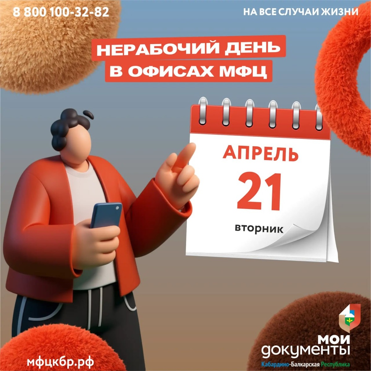 нерабочим днём в Кабардино-Балкарской Республике. В офисах "Мои Документы" Кабардино-Балкарской Республики устанавливается следующий режим работы: 🔸 21 апреля (вторник) - нерабочий день во всех офисах; 🔸 с 22 апреля (среда) все офисы начинают работать для Вас по обычному графику. За дополнительной информацией Вы можете обращаться по телефону горячей линии 8-800-100-32-82. Есть вопрос? Пишите ✏️ 🤎 #МФЦКБР #МФЦ #МоиДокументы #Госуслуги ✏️Подпишись Телеграм 💬| ВКонтакте 💙| МАКС 💬