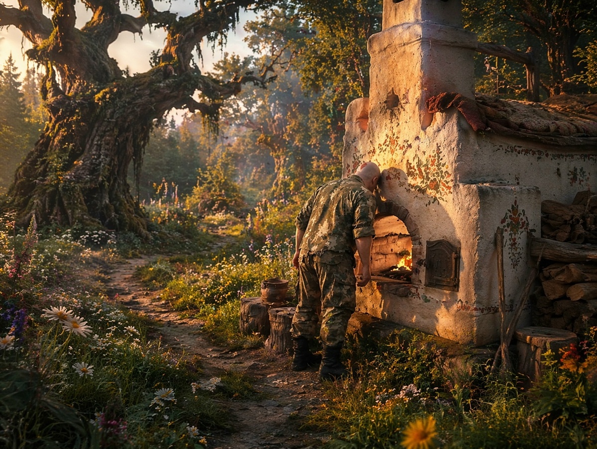 Посреди заросшего буйной травой пространства стояла печь… Ни стен, ни крыши, только печь. Основательно так стояла, хозяйственно – как так и должно быть. Из трубы шел дымок, за прикрытой заслонкой поблескивал огонь, одуряюще пахло свежим хлебом, сбоку аккуратно сложена поленница.