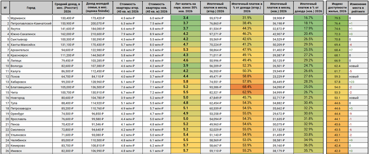 Второй год замеряю доступность недвижимости в городах РФ по собственной методологии. Что она учитывает: ▪️ Медианный доход по регионам. В моем случае это функция от среднего дохода (65% от среднего). В расчете смоделирована ситуация, в которой молодая семья получает 2 медианных дохода по своему региону. ▪️ Доступность вторички. Наша модельная молодая семья откладывает часть дохода на первоначальный взнос, а потом берет вторичку в ипотеку по рыночной ставке на 15 лет (30% взнос). Рыночная ставка взята как 20% годовых, и она упала с 25% годовых - то есть, мы ожидаем повышение доступности жилья в целом по стране, т.к. используется кредитное плечо с меньшей нагрузкой. ▪️ Доступность новостроек. Здесь также молодая семья копит на первоначальный взнос (30% от стоимости квартиры), а потом берет ипотеку по льготной ставке. Так как льготные ставки это не всегда заявленные 6%, то для расчета взята ставка 7%, а также учтена арктическая и ДВ ипотека для ряда городов. Результат - в таблице. Стоит о