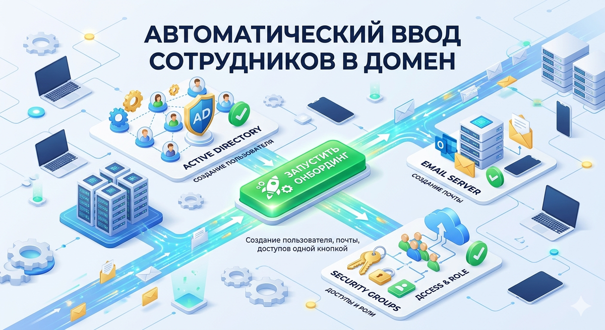 При приёме нового сотрудника администратору приходится выполнять множество рутинных операций. Создать учётную запись в Active Directory, задать пароль, настроить членство в группах, создать почтовый ящик в Exchange (или в Office 365), назначить доступ к сетевым папкам, а иногда и создать учётную запись в 1С или других корпоративных системах. Всё это занимает время, отвлекает от более важных задач и, что самое неприятное, часто делается вручную, что приводит к ошибкам (неправильное имя, не та группа, забыли создать почту). Нужно автоматизировать процесс так, чтобы ввод нового сотрудника выполнялся по нажатию одной кнопки (или через простую форму) с минимальным участием администратора.