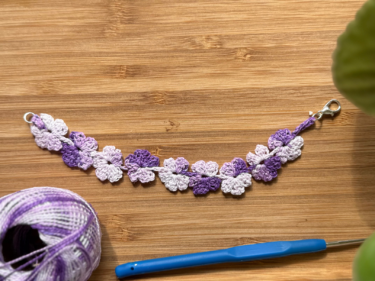 Первый цветочек готов! Продолжаем вязать пока не наберется достаточно цветов. У меня браслет состоит из 9 цветов.