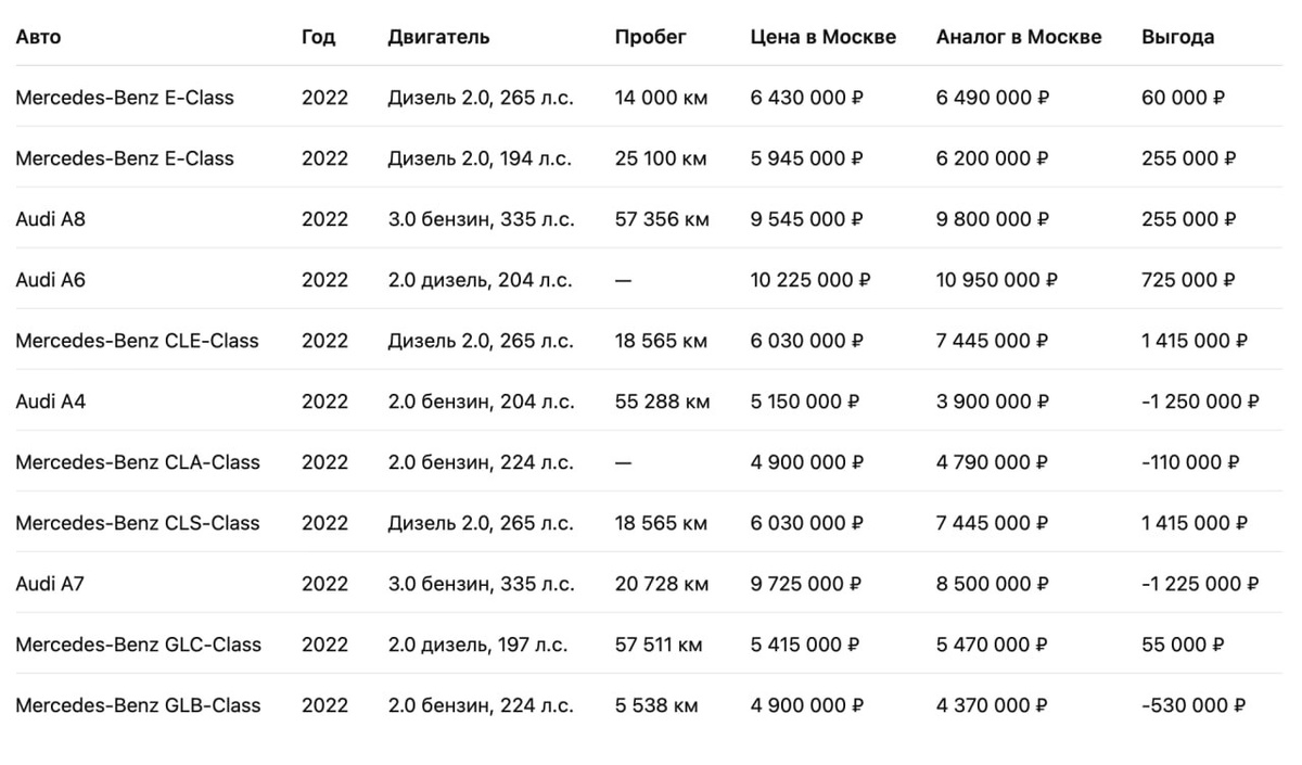 Решил подбить данные за последние 11 дней. Вряд ли вы заметили, но в постах появилось сравнение. Теперь у каждой машины две цены. Цена в Москве — это за сколько можно привезти. Аналог в Москве — это сколько стоит похожая машина на рынке. Это поможет вам увидеть реальную разницу и понять что выгодно везти, а что нет. Из машин которые рассмотрели я выделил 3 группы: 1 можно зарабатывать или сильно экономить 2 можно сэкономить и получить хорошую машину 3 можно везти, если экономия не важна Выгодно везти и себе, и на перепродажу — Mercedes-Benz CLE / CLS и Audi A6. Разница держится в диапазоне от ~750 000 до 1 400 000 ₽. Тут есть запас, с которым можно работать. Можно везти под себя — E-Class и A8. Разница около ~250 000 ₽. Экономика есть, но не сильно большая. Не стоит везти, если цель — заработать или сэкономить — Audi A4, A7, GLB, CLA. В Москве они дешевле или стоят так же. ↓↓↓ @sergeysuschik +7 926 797-40-40 Я в Dzen, я в телеграмм