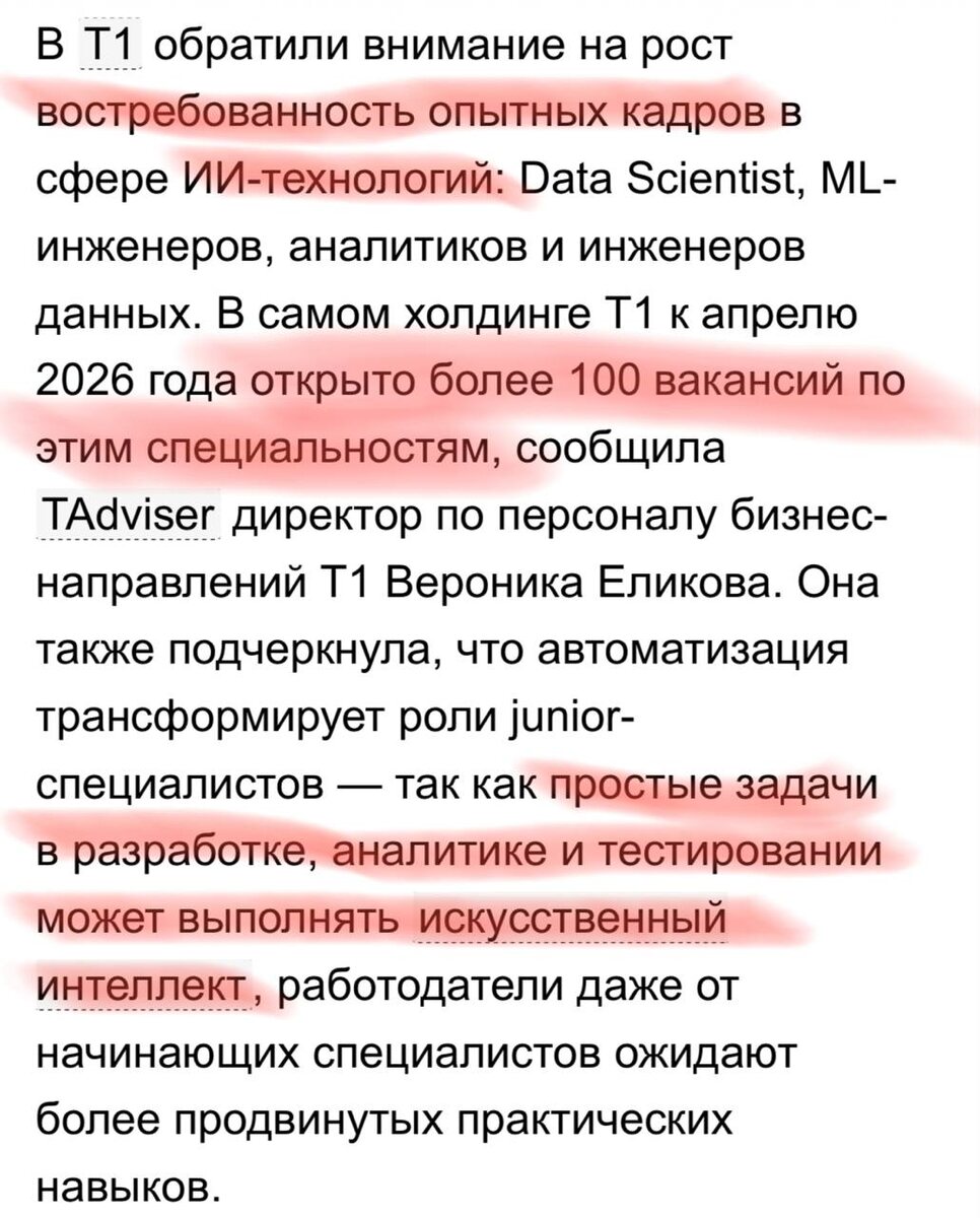 Холдинг Т1 - один из крупнейших российских IT-игроков 🖥 Прямо сейчас он держит открытыми больше 100 вакансий специалистов по ИИ. Это апрель 2026 года, и это только одна компания нашей большой страны. По данным hh.ru, зарплаты специалистов, связанных с ИИ растут, в то время как зарплаты в финансах, маркетинге и управлении могут снижаться, потому что часть этих задач уже автоматизируется. Я это пишу не для того, чтобы вас напугать. Я к тому, что разрыв между теми, кто понимает ИИ, и теми, кто нет, уже конвертируется в деньги. Просто вдумайтесь! Сколько еще таких компаний по России? 🏦 Сколько вакансий висит прямо сейчас, которые некому закрыть? (а кадровый голод в ИИ огромен!) Рынок не ждёт, пока все разберутся. Он просто движется и забирает деньги туда, где есть понимание, как работают новые инструменты. И через пару лет мы вообще станем заложниками ИИ-навыков, потому что без них будем практически никому не нужны. 📍По всем вопросам относительно навыков ИИ, в том числе как их о