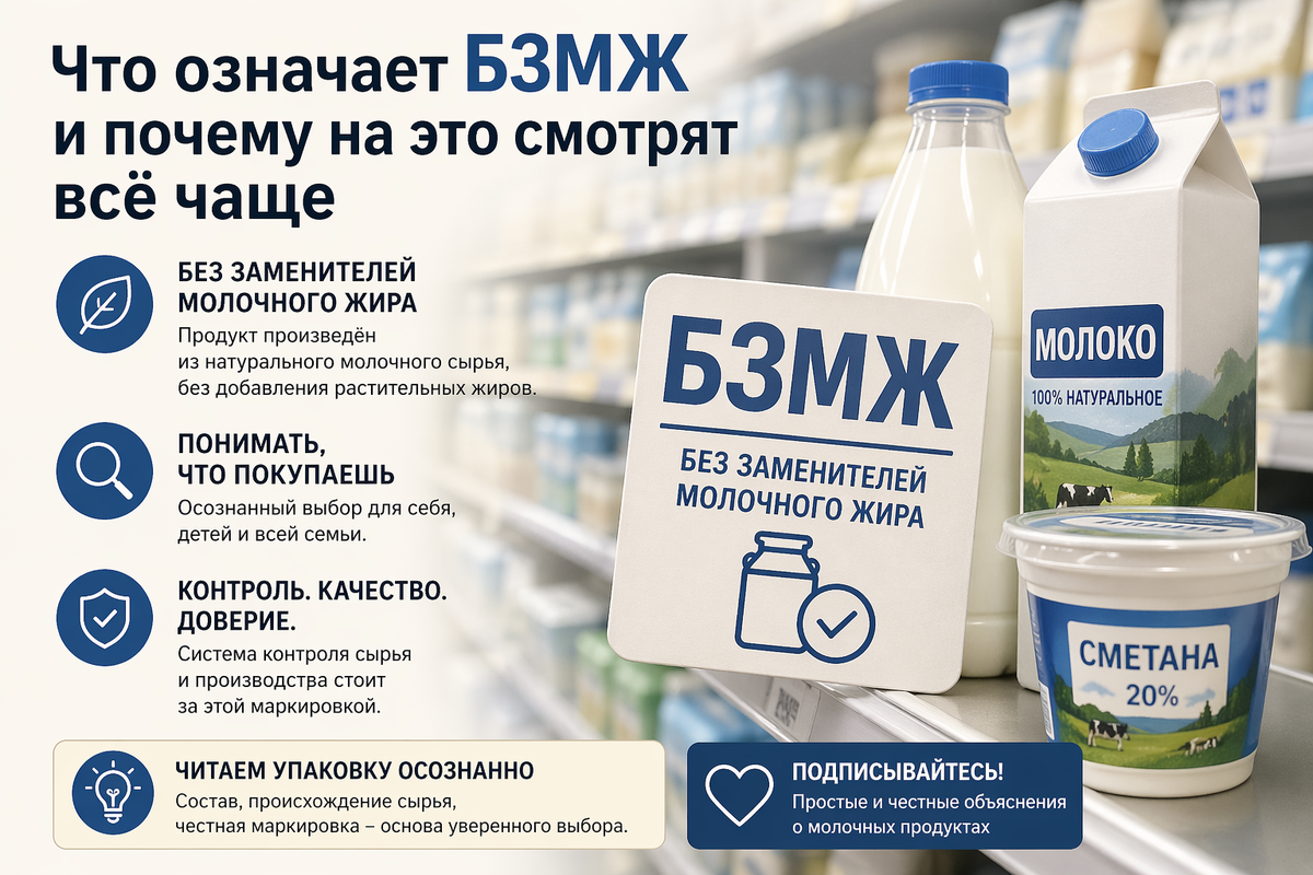 Когда покупатель выбирает молочные продукты, он всё чаще обращает внимание не только на вкус, срок годности или цену, но и на маркировку. Одна из таких аббревиатур, которую многие замечают на полке, — БЗМЖ. Для кого-то это уже привычный ориентир, а кто-то до сих пор не совсем понимает, что именно скрывается за этими буквами. На самом деле всё довольно просто. БЗМЖ означает: без заменителей молочного жира.