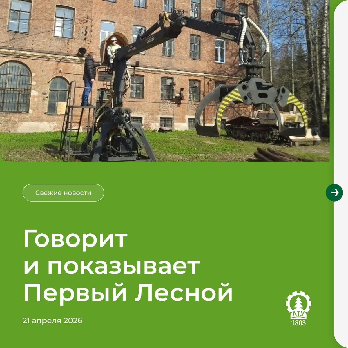 Собрали главные новости для вас 👇 🚜 Юные операторы за рычагами: школьники освоили гидроманипулятор в СПбГЛТУ — ученики ГБОУ СОШ № 128 Калининского района познакомились с устройством гидравлики и попробовали себя в роли операторов. Подробнее — на сайте СПбГЛТУ 🐱 Фестиваль «КО-Творчество»: лучшие работы в номинации «Котик глазами дизайнера» — участники показали, каким может быть образ кота в современном дизайне. Поздравляем победителей и делимся лучшими работами. Подробности — в МАХ 🌺 Симфония фиолетового на синем высоком небе — давайте просто полюбуемся этой красотой. Весна в Ботаническом саду СПбГЛТУ продолжает радовать яркими красками и нежными оттенками. Подробнее — в МАХ Следите за новостями Первого Лесного 💚