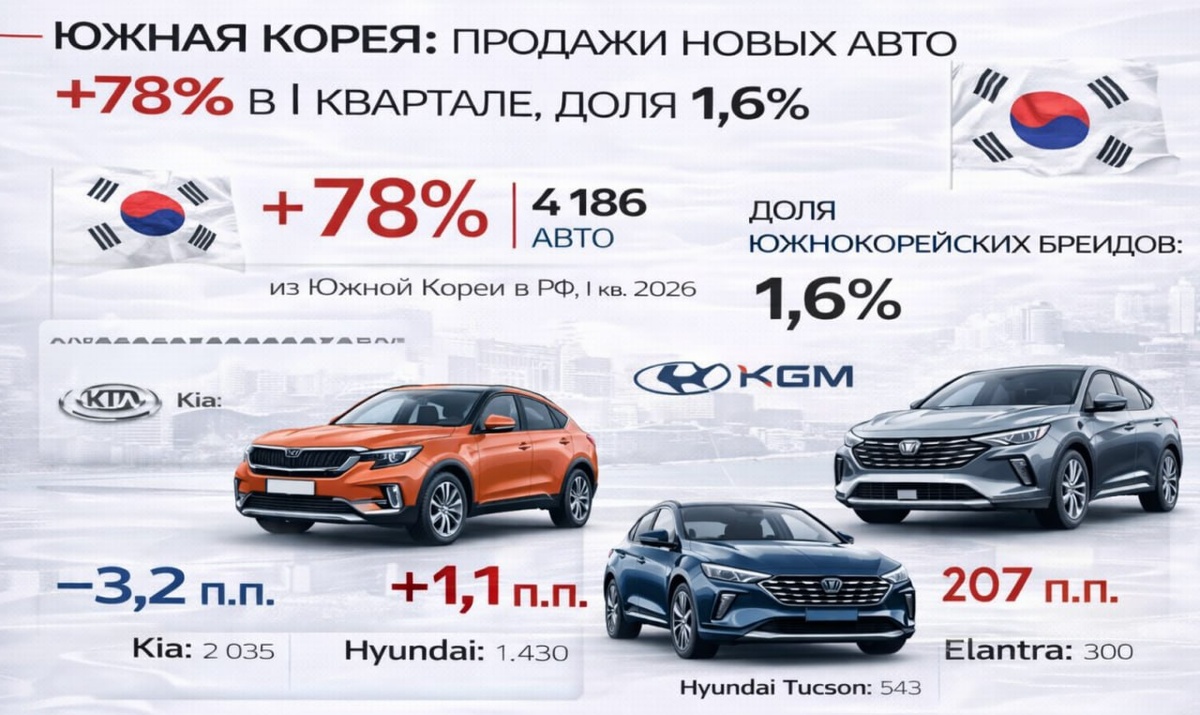 Как пишут «Ведомости», продажи новых автомобилей из Южной Кореи в РФ в I квартале 2026 года выросли на 78% и достигли 4 186 единиц. Доля южнокорейских брендов составила 1,6% (годом ранее 1%). В лидерах продаж марка Kia (2 035 ед.), Hyundai (1 430 ед.) и KGM (624 шт.). Топ-3 моделей вошли Kia Seltos (971 ед.), Hyundai Tucson (543 ед.), Hyundai Elantra (300 ед.). Эксперты отмечают, что на российском авторынке официально присутствует только KGM, остальные бренды поставляются по параллельному импорту. Это объясняет, почему рост идет без «официального возврата» брендов. Мы в Дзен Подписаться на канал Ассоциации автобизнеса ДНР