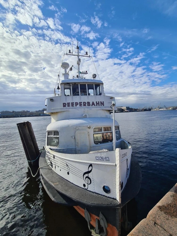 «Рипербан»/Reeperbahn, который на фото запечатлен у причала на набережной Лейтенанта Шмидта, построен 72 года назад в Гамбурге на верфи Ottensener Eisenwerke для местной судоходной компании HADAG. Материал для ВАС – Еще видео – на канале МорфлотСПб в МАХ: https://max.ru/brosur/AZ2vrlWhL5s Уже тогда в Гамбурге существовала прогремевшая на весь мир улица Reeperbahn — центр ночной жизни, свободы и рок-н-ролла, в честь которой и назвали паром. Атмосфера развлечений быстро перенеслась на его борт: судно стало культовой плавучей площадкой для вечеринок и музыкальных джемов. Со временем «Рипербан» приобрел статус знакового места для музыкантов. Этому способствовала и его «прописка» — район Санкт-Паули, где, собственно говоря, начиналась карьера «ли