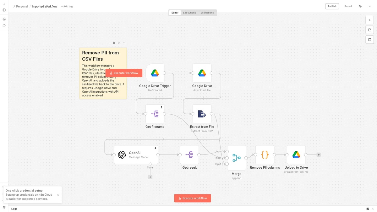 ⚡ Что делает: Автоматизация отслеживает новые CSV файлы в Google Drive, извлекает данные и передает их в OpenAI для удаления личной информации. Чистые данные сохраняются обратно в Google Drive. 👥 Кому подойдёт: Подходит для компаний, работающих с данными клиентов и желающих обеспечить конфиденциальность. 💡 Пример: Предприятие загружает CSV с данными клиентов, и автоматизация очищает их от имен и адресов. 🔗 Ноды: googleDriveTrigger, googleDrive, extractFromFile, OpenAI, merge, googleDrive, splitOut, code, stickyNote 📊 Сложность: Средний #n8n #automation #nocode #extractfromfile #googledrive #googledrivetrigger ════════════════ 🎬 YouTube | ⚙️ Канал | 💬 Чат | 📮 Реклама