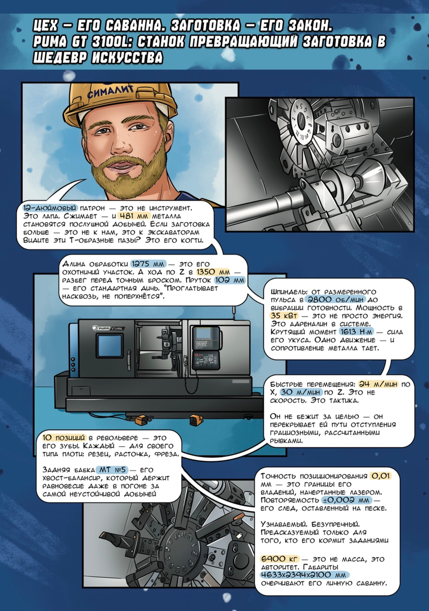 Через визуальную подачу и метафоры раскрываем характер станка: его мощность, жёсткость конструкции и возможности при обработке крупных заготовок 🏭