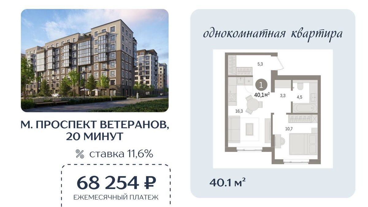 🚇 Транспортная доступность: 20 минут до метро «Проспект Ветеранов» 🤩стоимость квартиры 7 712 100 ₽ 🤩ипотека под 11,6% 🤩первоначальный взнос 2 000 000 ₽ 🤩ежемесячный платеж 68 254 ₽ 🤩срок 15 лет 📧 Все подробности и подбор квартир — в боте: @eon_bot 🤩Быстро, удобно и без лишних звонков Если у вас плохо грузятся фото и видео, то подписывайтесь на наш канал в MAX нажав здесь на текст