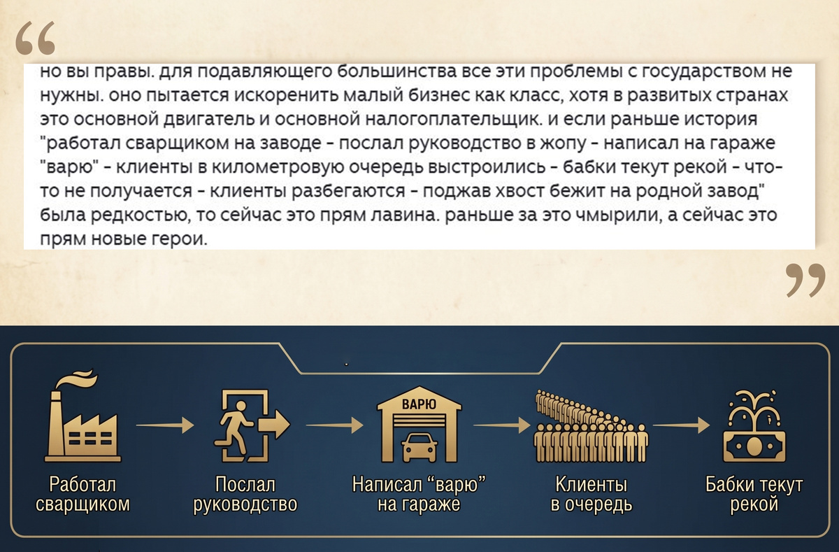 Один из читателей дружественного блога оставил потрясающий комментарий. На мой взгляд, он описал эволюцию малого бизнеса в России за последние десять лет так точно, что это можно вносить в учебники по экономике. Вот здесь часть комментария (а вообще - он объемный, там много тем для размышления): Работал мужик сварщиком. Надоело. Послал начальника по известному направлению, открыл свой гараж, повесил табличку «Варю» — и к нему выстроилась километровая очередь. Сарафанное радио, самосваренная рекламная табличка, воткнутая в землю на обочине трассы, заметка в газете бесплатных объявлений или на столбе. Бабки текут рекой. Или – не текут. Случалось и так, что тот мужик, поджав хвост, возвращался на родной завод. Как правило, через небольшой промежуток времени, меньше года. Это правда: «своё» дано не всем. Над возвращенцами смеялись в курилке. Не вывез, бизнесмен х-ов. Как абсолютно верно подметил читатель, возвращение из бизнеса в найм — это больше не редкость. Это настоящая лавина. И на