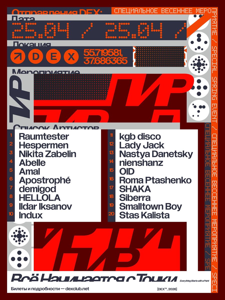 ПИР возвращается в DEX с праздничным лайнапом, чтобы отметить свою годовщину. Авторская серия событий диджея и продюсера Raumtester, выросшая из личного видения, музыкальных вдохновений и опыта. Пионеры сцены, новые имена, неожиданные бэк-ту-бэки, резиденты и друзья комьюнити. Задействованы все танцполы. Один из них превратится в экспериментальную звуковую среду с инсталляцией команды Timeless landscapes. 🎫 Билеты Дресс-код: красный 📆 25 апреля, в 23:00 📍DEX, Москва , Шарико- подшипниковская ул., 13, стр. 32
