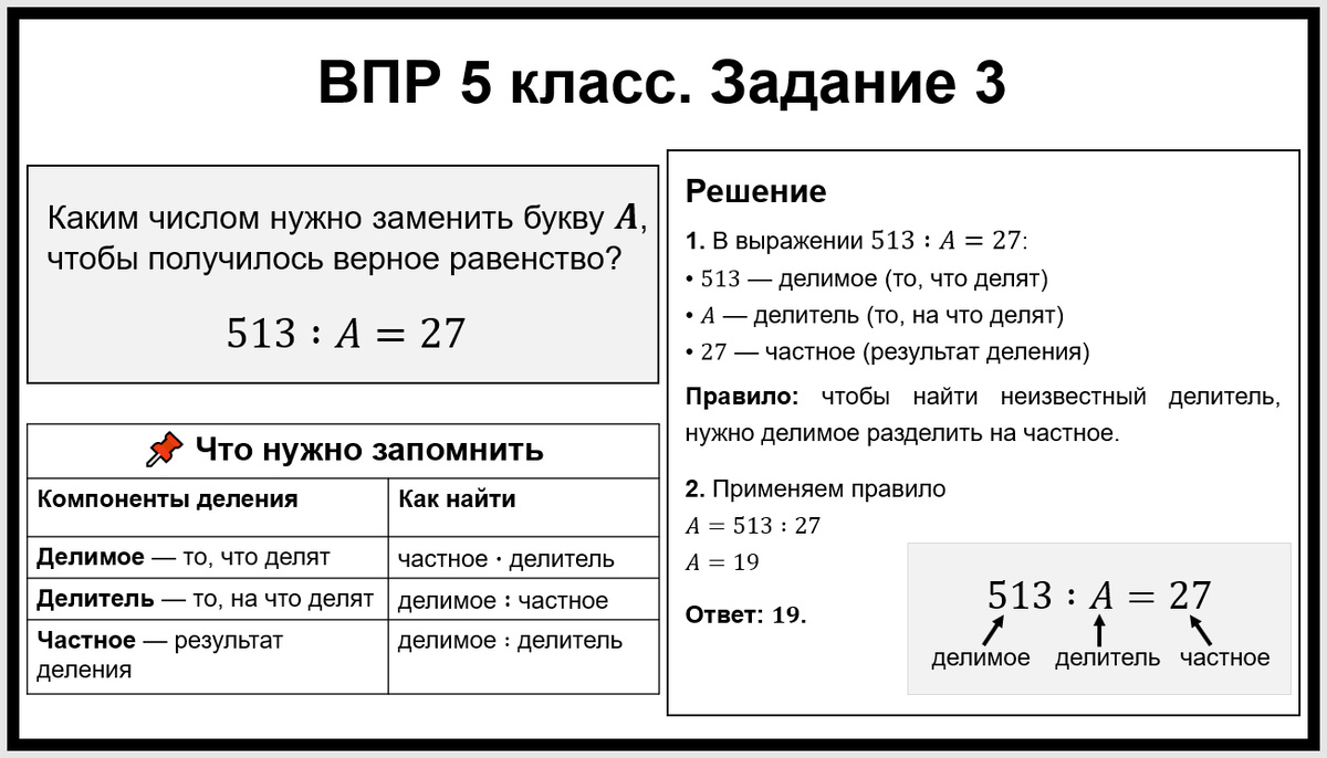 Разбор задания ВПР по математике 5 класс: как найти неизвестный делитель в уравнении 513 : A = 27. 📌 Условие: