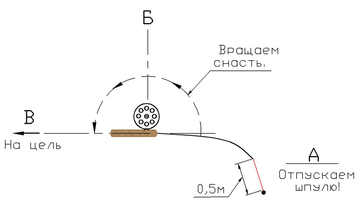 4. Ускоренно закручиваем (именно закручиваем, а не отводим!) удилище до положения А, стараясь двигать им так, чтобы приманка «оттягивала» леску (как в ролике здесь).