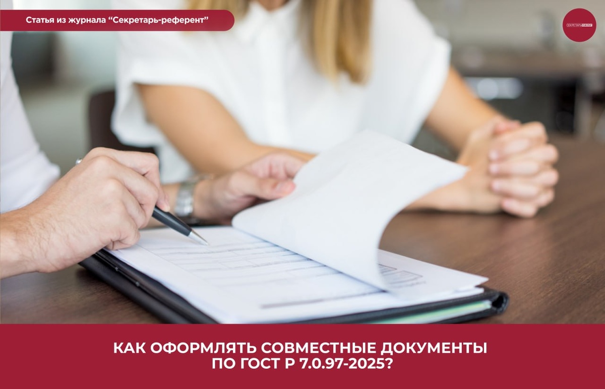 " Как оформлять совместные документы по ГОСТ Р 7.0.97-2025? Что такое совместный документ и какие новые нормы в сравнении с предыдущей редакцией стандарта появились в ГОСТ Р 7.0.97-2025? Что нового в описании бланков и реквизитов? Какие нормы доработаны, а какие сохранились без изменений. Получите ответы на эти вопросы. Читать статью
