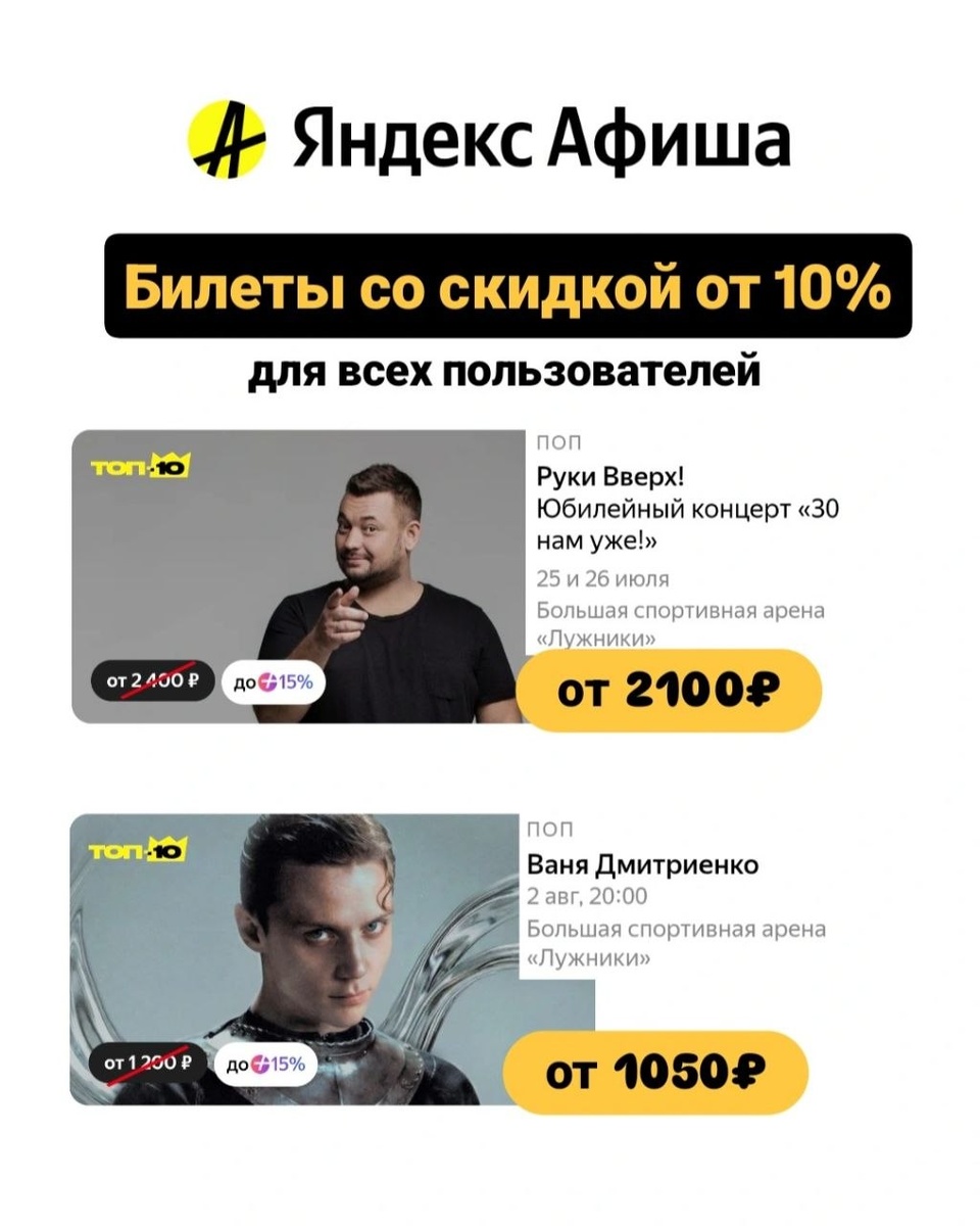 🔥 На самые ожидаемые летние концерты в Лужниках еще остались билеты! Забирайте с выгодой💛 На первую покупку: 💥 ХХХ — скидка 300₽ от 2000₽ 💥 ХХХ — скидка 400₽ от 3000₽ 💥 ХХХ — скидка 750₽ от 5000₽ На первую и повторные покупки: 💥 ХХХ — скидка 10% от 3000₽, без ограничений по сумме скидки🥳 Приобретайте билеты в Яндекс Афише 👉 по ссылке ❗️Применяются на покупку любых билетов, КРОМЕ подарочных сертификатов, билетов в кино и при оплате Пушкинской картой *не суммируются с акциями и спецпредложениями #яндекс_афиша