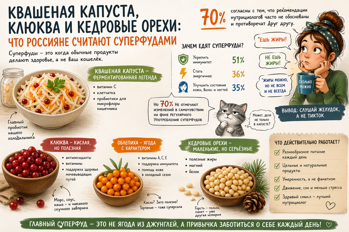 Слово суперфуд звучит так, будто после одной ложки продукта человек мгновенно просыпается в 5:30, бежит марафон и наконец-то разбирает балкон. На практике всё куда скромнее: это просто продукты с высокой питательной ценностью. Без спецэффектов. Согласно опросам, россияне всё чаще относят к недооценённым суперфудам не экзотические ягоды из далёких стран, а вполне родные продукты: квашеную капусту, облепиху, клюкву, кедровые орехи. И в этом есть здравый смысл. Потому что суперсила иногда живёт не в порошке из джунглей, а в банке из холодильника. Чаще всего - чтобы: Звучит прекрасно. Но есть нюанс: 70% людей не замечают заметных изменений в самочувствии, даже если едят такие продукты регулярно. И это не заговор брокколи. Просто один продукт не способен заменить сон, движение, нормальный рацион и отсутствие привычки ужинать печеньем в полночь. Когда кто-то покупает дорогой пробиотик, где-то тихо улыбается банка капусты. Квашеная капуста содержит: Хорошо сочетается с картофелем, мясом, круп