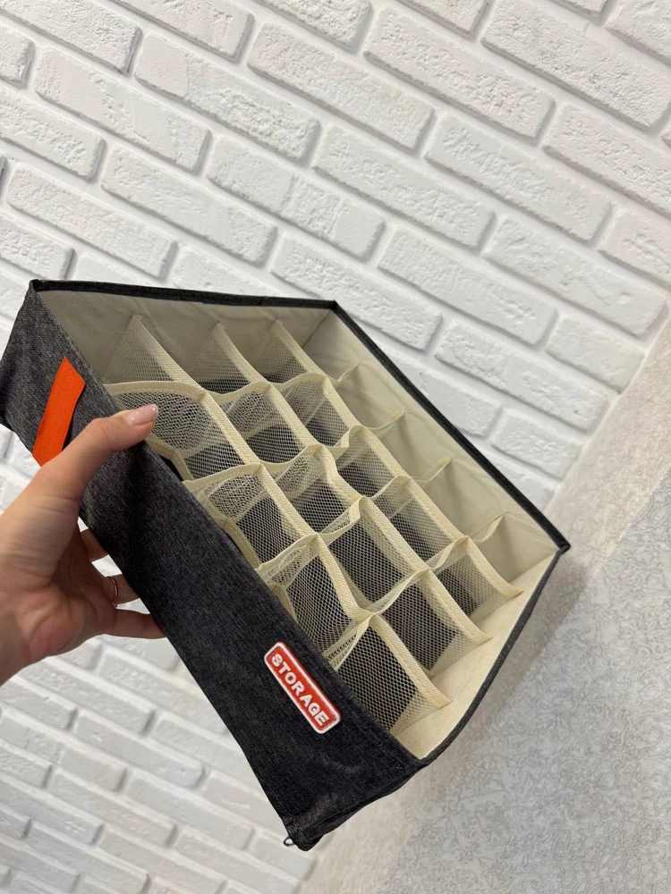 Я закинула его в шкаф — 20 ячеек для белья и носков, всё видно через сетку, ручка для удобства. Складывается, из влагостойкого Оксфорда с пластиковыми стенками. Размер 32х32х11 см. Артикул: 317966099 / Цена: 475 руб.