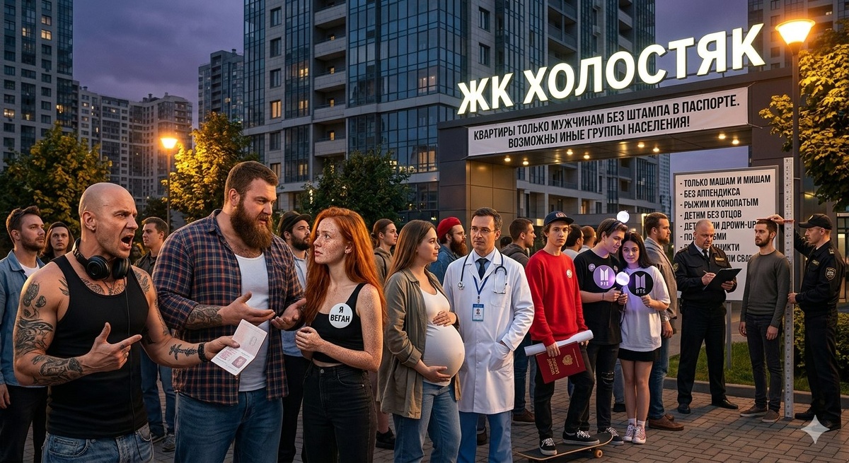 Однажды моя незамужняя подруга стимулировала меня на забавное рассуждение о жилом комплексе с названием "Холостяк". Мы придумали продавать там квартиры только мужчинам без штампа в паспорте ))) ... и вот опять я об этом вспомнила и подумала как можно довести эту идею до абсурда... Итак варианты сегрегации: - квартиры только Машам и Мишам, ну или всем у кого имя на букву "М" - людям с ростом более 165 см - только беременным и только по справке от врача - только рыжим и конопатым - только врачам - только тем у кого золотая медаль была или красный диплом - только детям, которые выросли без отцов - только тем кто умеет кататься на скейтборде - только людям с весом не менее 120 кг. - только тем кто заикается и грассирует - только лысым - только тем у кого нет аппендикса - только певцам и музыкантам - только веганам - только фанатам BTS - только тем, кто пришел в красном - только межрассовым семьям - только тем у кого аллергия на арахис продолжите?? Вообще и сбытовые акции короткие можно д